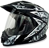 NEW AFX FX-39 DUAL SPORT MOTORCYCLE HELMET, URBAN BLACK, MED/MDAn aerodynamic shell design constructed using an advanced lightweight composite poly-alloy. A helmet liner and cheek pads made with a hypoallergenic and anti-microbial nylon, all of which are removable and washable. 9 points of ventilation. A clear coat finish to protect paint & graphics. Comes with a Limited Lifetime Warranty. A flip-up, flush-fit, quick-release, single-turn screw face shield with side covers. The shield itself is optically correct, compound-curved, scratch-resistant and protects against UV-rays. There are several tinted shields available for this model. Shield can be removed to allow open face riding or goggle use. Retention system is quick release with sewn on ECE logo.